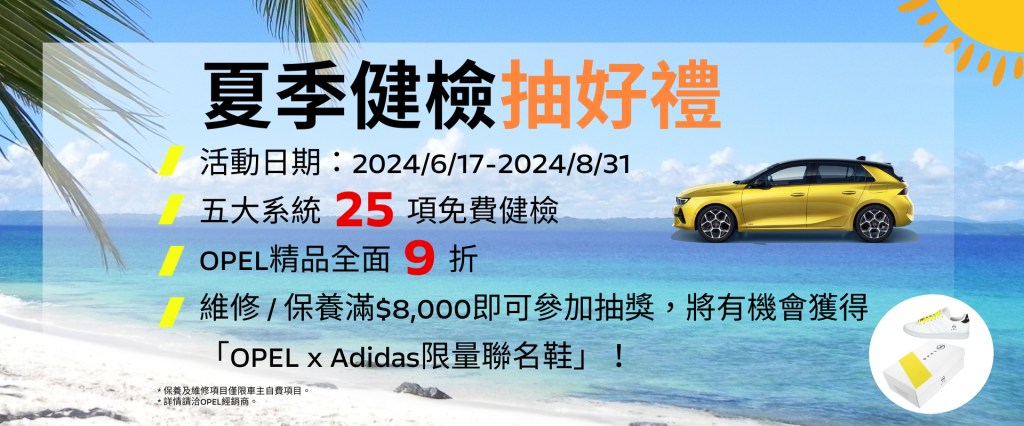 - OPEL夏季健檢服務將於6月17日至8月31日展開,預約回廠即享5大系統25項免費車輛健檢服務,且活動期間凡車主檢查、維修或是消費滿8,000元,就有機會獲得價值11,000元的「Opel x Adidas 全球限量聯名鞋」。活動期間也特別推出原廠精品全面9折優惠,數量有限,售完即止。