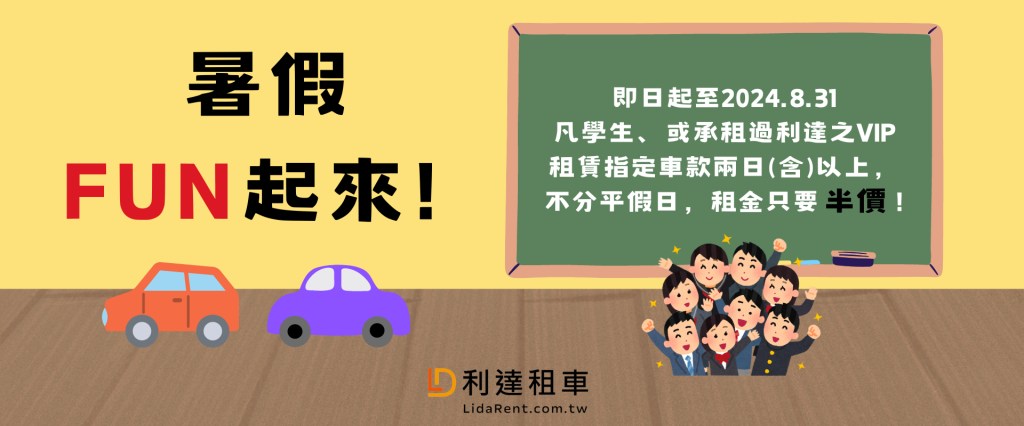 - 即日起至8/31止,凡學生憑證或利達租車VIP客戶於活動期間租賃指定車款達兩日(含)以上,不分平假日,租金一律半價。