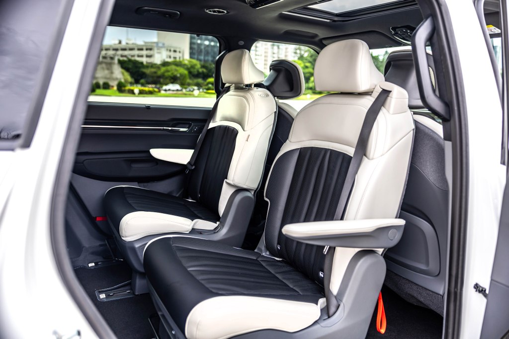在GT-Line版本除了七人座外,還可選擇旋轉六人座及Ottoman 尊榮六人座:旋轉六人座能夠將座椅向外90度或向內180度調整,方便乘坐者自由調整車內空間,能夠輕鬆地與其他乘客互動和交流,多樣的座椅變化大幅提升車室空間的使用;尊榮六人座椅則提供第二排電動調整功能、蝴蝶枕、電動腿托與一鍵舒適功能以及中央收納箱含托盤,貼心的設計打造最高級的乘車享受。The Kia EV9打造隨心所欲的尊榮乘坐享受,提供多樣變化的車室空間。
