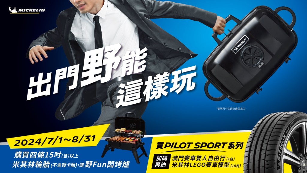 台灣米其林始終致力於為消費者提供卓越的品質和創新技術,保障消費者在道路上的安全可靠與輪胎持久性,自去年導入的高性能電動車胎PILOT SPORT EV與PRIMACY 4 +胎款,也以「準、久、靜」三大產品優勢,帶給車主們更多駕馭的樂趣,成為眾多車主的首選。今年夏天,台灣米其林看準消費者在平日煩悶的工作之餘,內心對於「野」的渴望,推出夏日限時優惠,7月1日起至8月31日,凡於台灣米其林輪胎官方網站公告銷售通路,購買四條15吋(含)以上的輪胎,即可獲得米其林摺疊野Fun悶烤爐,讓你瞬間成為全場目光焦點;此外,如指定購買Pilot Sport系列輪胎,還能再加碼抽澳門格蘭披治大賽車雙人自由行及樂高®科技系列Porsche GT4 e-Performance Race Car 遙控賽車盒組。米其林輪胎完整佈局多元胎款,旨在讓消費者有最全面的選擇,無論各式場景與路況,都能提供最佳的駕車體驗,今夏,跟著米其林一同「野」出新高度。