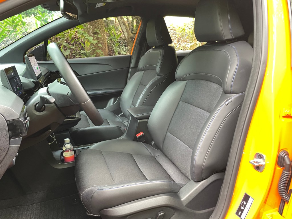 基本上要從外觀分辨旗艦版與X POWER乍看之下很難,尤其是在路上奔馳時動態狀態下根本無從辨別,因此在靜態下僅能從橙色煞車卡鉗、黑化運動套件、輪圈造型、前後保險桿下方等細微處著手,再不然就是旗艦版少了AWD的銘牌,18吋輪圈也換上附低風阻飾蓋配置,簡單來說一時半刻真的難辨。而旗艦版是採用後輪驅動設定,有別於X POWER的四輪驅動,也就是超頭少了一組驅動馬達,所以和X POWER的1,800公斤相比,旗艦版的1,672公斤的噸位更貼近傳統燃油車設定,駕馭起來也比較輕巧,當然也是續航能力增加的因素之一。具有相同內裝的鋪陳和設計,旗艦版和X POWER可說是架構在完全相同的骨子,不過配置織布和皮革所組成的座椅,雖觸感不及麂皮和皮革來得高級,但質感和乘坐舒適性並沒有因此打折,我個人也比較偏好這種材質。