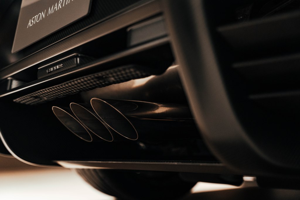Valour的尾燈造型呼應品牌旗艦超跑Valkyrie,每側六盞LED燈片坐落於實心鋁製材質加工的飾條內,隱藏在碩大後下擾流的三出排氣系統則由極為輕薄、管壁厚度小於1mm的不銹鋼製作而成,相比傳統材質減少了7公斤重量,完美傳遞宛如天籟的V12渾厚高亢聲浪。