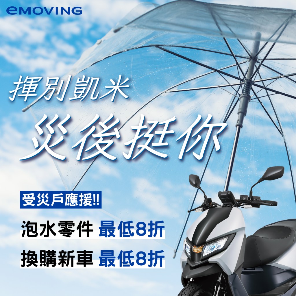 eMOVING關心您的愛車,若車主的車輛因風災受損需回廠維修,即日起至8月15日,可至全國各地eMOVING機車經銷據點(詳情請見eMOVING官網),經由經銷門市技師判定為災損車,即享有更換原廠指定零件8折優惠。指定項目包括:馬達、馬達控制器(MCU)、車身控制電腦(BCM)、儀表、變壓器、電子龍頭鎖(ESCL)、及繼電器。此外,eMOVING針對泡水受損的車輛,推出汰舊換新方案。符合購車資格的車主,可享最低8折的優惠價購買指定新車,並為了減輕車主負擔,還可同享多元分期付款,讓您輕鬆擁有新車。