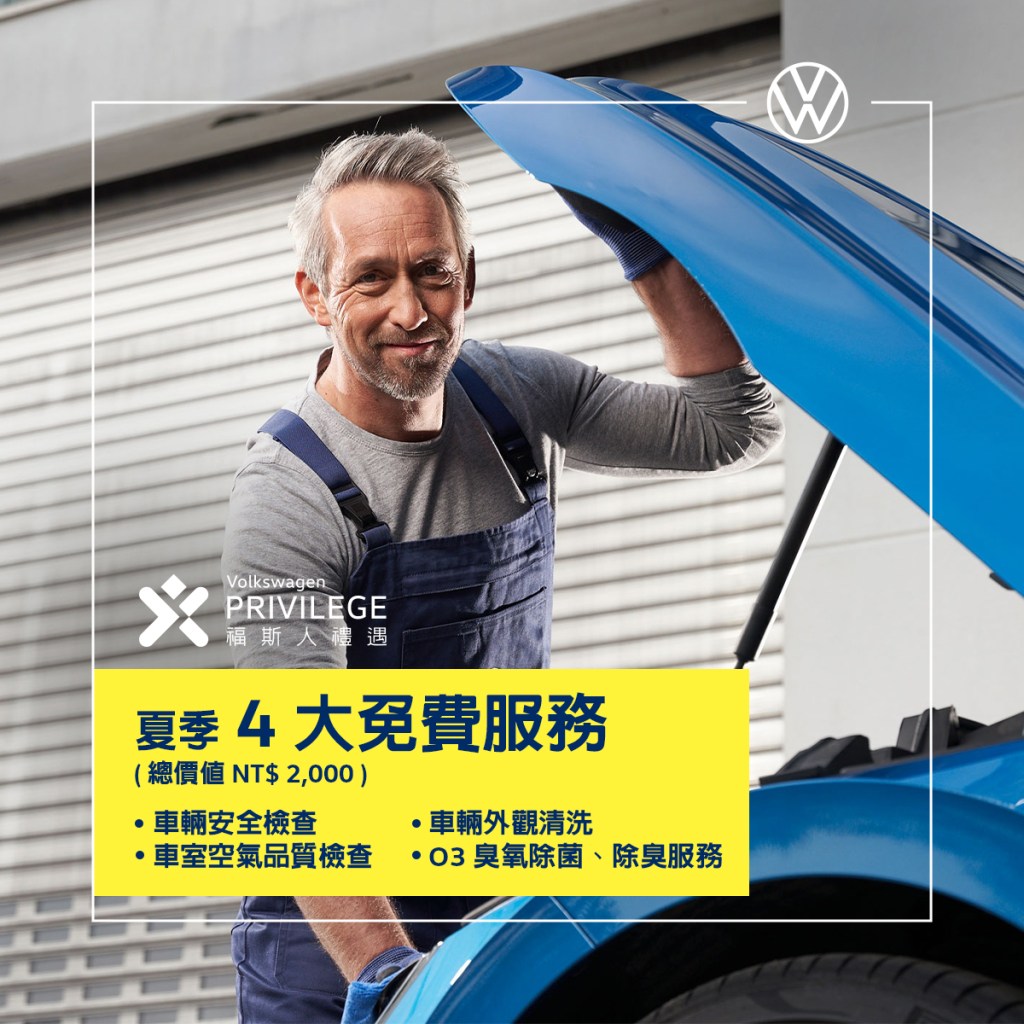 台灣福斯汽車總裁 Steffen Knapp 表示:「Volkswagen 關心全台車主的安危以及行車狀況,凱米颱風造成台灣淹水災情嚴重,台灣福斯汽車是所有車主堅實的後盾,在颱風過後檢查愛車,上路多一分保障。」此次夏季健檢活動的4大免費服務,包括車輛安全檢查、車室空氣品質檢測、O3臭氧除菌/除臭和車輛外觀清潔項目。同時,福斯人禮遇計畫會員獨家指定原廠耗材、冷氣零件、煞車盤/來令片、抗敏防螨粉塵濾網及原廠電瓶75折起,原廠電瓶還有業界最長三年保固(註1),同時風箱清洗1,688元起(含工資)以及米其林輪胎買3送1,再加送輪胎保固,而回廠購買指定原廠精品及配件再享優惠55折起,讓車主愛車回到最佳駕駛狀態。