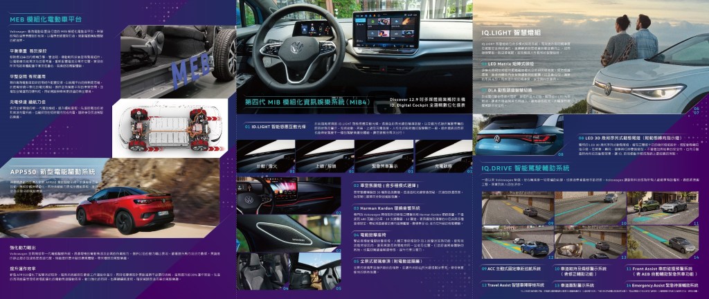 科技方面,The new ID.4、The new ID.5 具備超越 Level 2 等級的 IQ.DRIVE 智能駕駛輔助系統,車室為在台首款與德國同步第四代 MIB 模組化資訊娛樂系統(MIB4)和 ID. 車系特色 ID.LIGHT 智能感應互動光條,根據車輛啟閉、上/解鎖、緊急煞車和充電狀態變換色彩與光條,設計智慧又具人性化互動,同時透過先進燈光科技 IQ.LIGHT 智慧燈組:LED Matrix 矩陣式頭燈與 DLA 動態頭燈智慧切換提升照明精準,加上 LED 3D 幾何序列式動態尾燈,守護夜間駕駛安全。內裝標配雙前座多向電動座椅附電動腰靠及按摩功能、Discover 12.9 吋多媒體鏡面觸控螢幕與 Air Care Climatronic 三區電子恆溫空調,帶來科技又舒適的駕乘體驗,The new ID.5 Pro S 及雙 GTX 車型更配備 Harman Kardon 環繞音響系統及全景式玻璃車頂(附電動遮陽簾)打造豪華聽覺饗宴、享受充沛自然光線與優美風景,另外,不同車型各擁有專屬內裝配色,The new ID.4 Pro S 具有翡冷翠灰棕雙色內裝,The new ID.5 Pro S 搭配銀霧灰,GTX 車型皆佈上帥氣黯夜黑色內裝,提供消費者多樣乘車體驗。