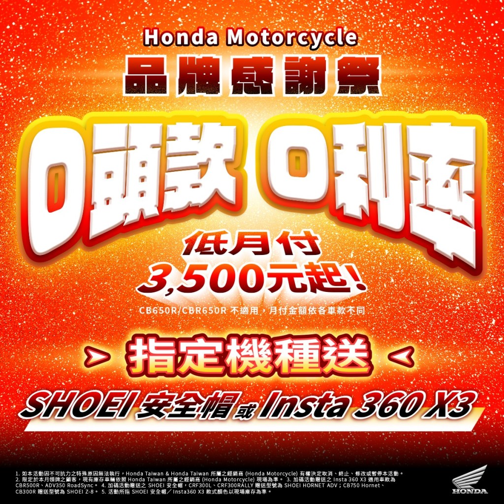 為了讓所有喜愛Honda Motorcycle的顧客輕鬆入主夢想座駕,共同加入二輪生活的行列,特別推出「品牌感謝祭」優惠活動,全車系享零頭款、零利率、低月付3500起(CB650R/CBR650R不適用),讓所有顧客皆能更加輕鬆入手夢想座駕。另外,指定車款加碼再送精美好禮,剽悍性能街車CB750 Hornet、冒險玩家CRF300L/CRF300 RALLY、復古率性CB300R,訂購以上車款並完成領牌,即贈Shoei安全帽,讓騎士在城市巷弄間的穿梭或是蜿蜒不絕的山路上,皆能從容不迫享受騎乘的樂趣。此外,針對熱血運動靈魂CBR500R及跨界城市遊俠ADV350 RoadSync,訂購並完成領牌即贈Insta360全景相機,完美紀錄騎乘的精采瞬間,敬邀所有喜愛二輪生活的顧客,把握機會,即刻入手心儀的車款。
