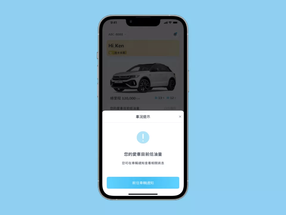 - 登入My Volkswagen App 綁定裝置後,就能使用查詢車輛狀態/提醒、行駛紀錄、接收車輛通知、設定地理圍欄及駕駛時間這 5 大功能,一手掌握愛車資訊。