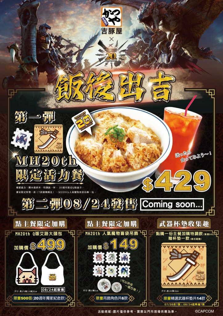 7月27日(六)到8月23日(五)止,〈吉豚屋〉推出MH20th限定活力餐,餐點內容除了吉豚屋人氣招牌:腰內豬排丼以及特調飲品五選一,另包含魔物獵人20週年限定Q版插卡、精選武器杯墊(首波推出共7款隨機贈送),以及MH20th人氣魔物盲袋吊飾,超值組合只要429元,現省28元!除此以外另有兩大驚喜商品:一、選購任一主餐,即可以149元加購MH20th人氣盲袋吊飾,共有雌火龍、火龍、迅龍、轟龍、碎龍以及雷狼龍六款人氣魔物圖騰,集滿六片吊飾還可拼成方塊組合!二、選購任一主餐加點特調飲(49元),即贈送武器杯墊乙個,首波杯墊設計將有七款,包含大劍、大錘、斬擊斧、狩獵笛、雙劍、太刀及充能斧等圖像,款式將隨機贈送。獵人們快來試試手氣,看看是否獲得自己最愛用的那款武器?
