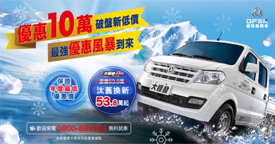 DFSK 穩發商用車【優惠 10 萬,破盤新低價】優惠專案現正開跑中,於活動期間,購買「大穩發 S2.5t」,汰舊換新補助通過享有最低 53.8 萬元起,再贈送價值 20,000 元配件 (配件折抵依經銷商配件為主);購買「金穩發 S2.5t」汰舊換新補助通過享有最低 41.8 萬元起,再加碼贈送價值 10,000 元配件 (配件折抵依經銷商配件為主),保證年度最低優惠價!
