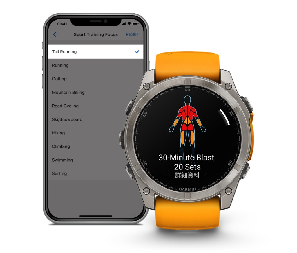 Garmin整合旗下領先全球的生理數據分析公司Firstbeat Analytics之運動科學研究,提供精確的運動表現解析,全新打造專項運動肌力訓練課表與週期性肌力訓練計畫,全面涵蓋器械與徒手訓練,針對專項運動的核心肌群進行訓練,幫助循序漸進達成個人目標,適用於自行車、越野跑、登山、滑雪、衝浪等各類專項運動。以越野賽跑為例,玩家可制定「跑步專項訓練」課表,手錶不僅顯示訓練目標及鍛練肌群,還會以動畫展示動作,陪你精確備戰每一步。