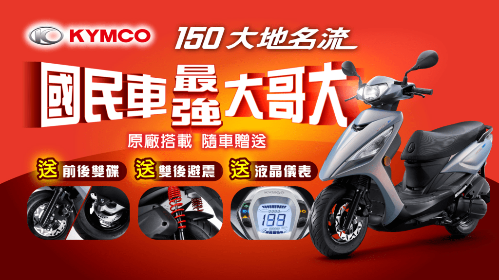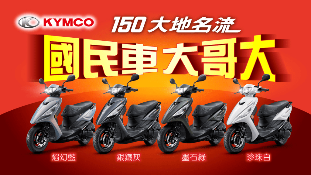 全球專業機車品牌KYMCO,始終堅持「最得我心」品牌理念,針對台灣為數眾多的通勤與通學的用車族群,打造多樣的國民車陣線,更早已成為國民機種的代名詞。以GP125、新豪邁125與125/150大地名流豐富等市場最多的國民車機種數,組成堅強國民車陣線;而150 大地名流更是市場中唯一一台150c.c. 的國民車款,再以汰舊最低58,800元的國民車價格 (建議售價 81,200元),向消費者送出「雙後避震器x前後雙碟x液晶儀表」。光陽國民車結合最新科技、豐富配備與高效環保動力技術,滿足國民的不同用車需求,成為國民車首選品牌!