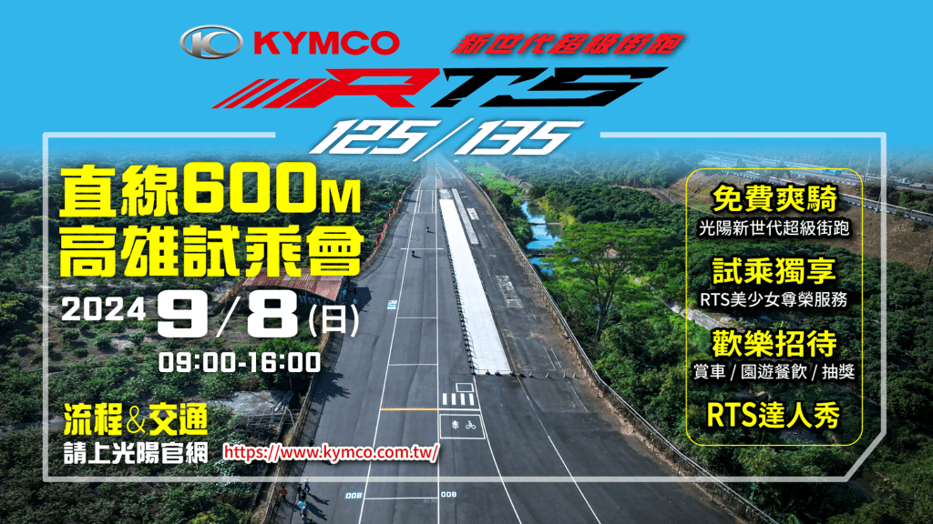 現場也安排RTS美少女提供尊榮服務,完成試乘後還有好禮可拿,更有園遊餐飲、抽獎與各界「RTS達人」詮釋RTS超級街跑的美譽與樂趣,同場更加映RTS 135表演活動。不論是RTS車友、準車主還是追求飆風快感的騎士,都歡迎在本週日 (9月8日) 到光陽旗山試車場體驗試乘!