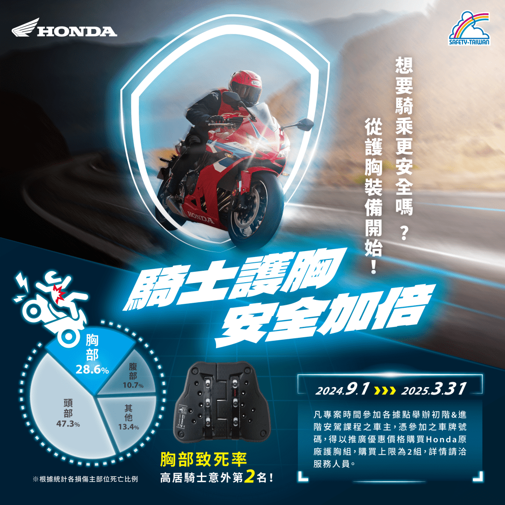 Honda Taiwan二輪事業以打造良好的用車環境及提供完善的車主服務為品牌核心,於今日推出「騎士護胸、安全加倍」專案,根據統計,騎士如不幸發生意外,胸部致死率僅次於頭部傷害,穿戴護胸可有效減少胸部所受到的撞擊力,進而降低受傷的風險,為了進一步強化騎乘的安全意識及保護措施,特別推出此項專案,希望同時透過安駕訓練及教育宣導,提高騎士們對護胸的認知並提高使用意願。