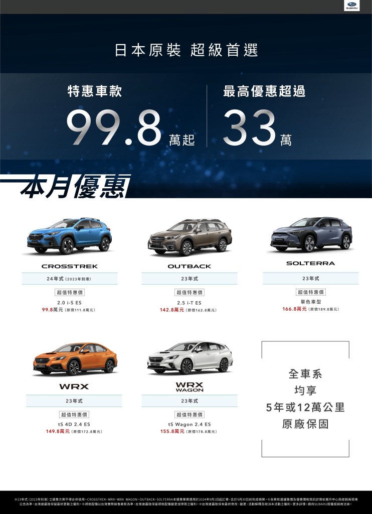 榮獲JNCAP五星大賞的SUBARU CROSSTREK跨界潮旅,不僅安全一把罩,也是同級唯一百萬內四輪驅動及水平對臥引擎的CUV,更採用三鏡頭的進階版EyeSight 4.0系統,本月99.8萬起即可輕鬆入主。豪華旗艦休旅OUTBACK可享142.8萬史上最強檔優惠,進口品牌LSUV最超值選擇。而WRC經典傳奇車款WRX同步即享特惠典藏價149.8萬,同級唯一對稱四驅性能旅行車WRX WAGON同享155.8萬特惠價格。純電最強四驅運動休旅SOLTERRA亦享有166.8萬的超優入手價格;此外SUBARU全車系均提供5年或12萬公里原廠保固。本月SUBARU精選特惠車款,讓每一位重視安全與熱愛駕馭的國人,輕鬆坐擁心中最理想坐駕,即刻前往SUBARU展間,尋找屬於自己的命定車款。
