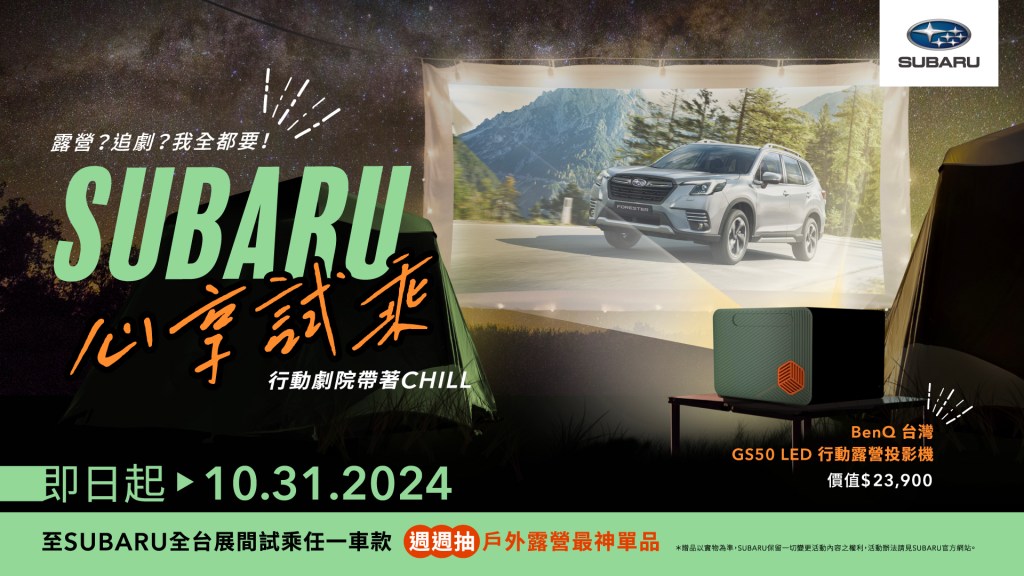 SUBARU台灣意美汽車自9月1日起至10月31日止,全面推出「SUBARU心享試乘 outdoor 露營追劇全都要!」活動,凡於上述活動期間內至全台SUBARU展間試乘任一車款,即可獲得抽獎機會,週週抽超Chill好禮(全球第一款1080P,搭載2.1聲道,20瓦大喇叭,防潑水的行動微型投影機,價值$23,900元)「BenQ GS50 LED 行動露營投影機」,越早至全台展示中心安排試乘,即可獲得越多抽獎機會。關於更多本次「SUBARU心享試乘」(註)活動之相關詳細內容,歡迎至SUBARU TAIWAN官方網站https://www.subaru.asia/tw/zh/home/ 查詢或洽全台展示中心:https://www.subaru.asia/tw/zh/how-to-buy/showroom-locations/,敬邀您前往官網預約試乘,或致電SUBARU展間預約試乘。
