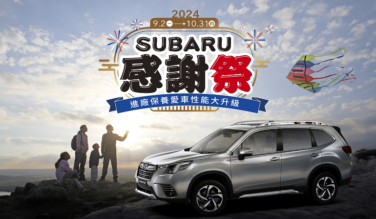 2024 SUBARU感謝祭大回饋即日起全面開跑,敬邀全台車主即刻預約回廠保養超享受,在原廠專業技師團隊的細心呵護下,讓您的愛車隨時保持最佳車況,陪伴您暢遊每一趟舒心的愉悅旅程!更多「2024 SUBARU感謝祭」詳細活動內容,歡迎至台灣意美汽車官方網站: https://www.subaru.asia/tw/zh/promotions/#查詢,或洽SUBARU全台服務廠:https://www.subaru.asia/tw/zh/owners/subaru-service.php,了解相關內容。