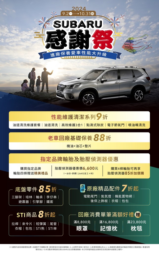 SUBARU始終堅持品牌核心精神、致力為消費者提供最優質的日本原裝精工車款,並提供每一位車主美好的自信駕馭體驗,多年來深獲熱愛戶外運動與休旅生活的認同與肯定。SUBARU台灣意美汽車真心感謝所有台灣消費者的愛護與支持,為此自9月2日起強勢推出「2024 SUBARU感謝祭」活動,除了為車主嚴格把關所有車況細節,更提供一系列原廠STI專用部品,大幅提升整體行車安全性。全台SUBARU車主凡於9月2日起至10月31日止活動期間預約回廠,即可享有全方位的高效維護和底盤強化升級服務,同時暖心提供六大優惠禮遇回饋車主們的熱情支持,回廠消費單筆滿額再加贈原廠精品好禮等好康,SUBARU原廠的專業服務團隊將以最優質的貼心服務細心照護每一位顧客的愛車,隨時開展精彩的人車生活。