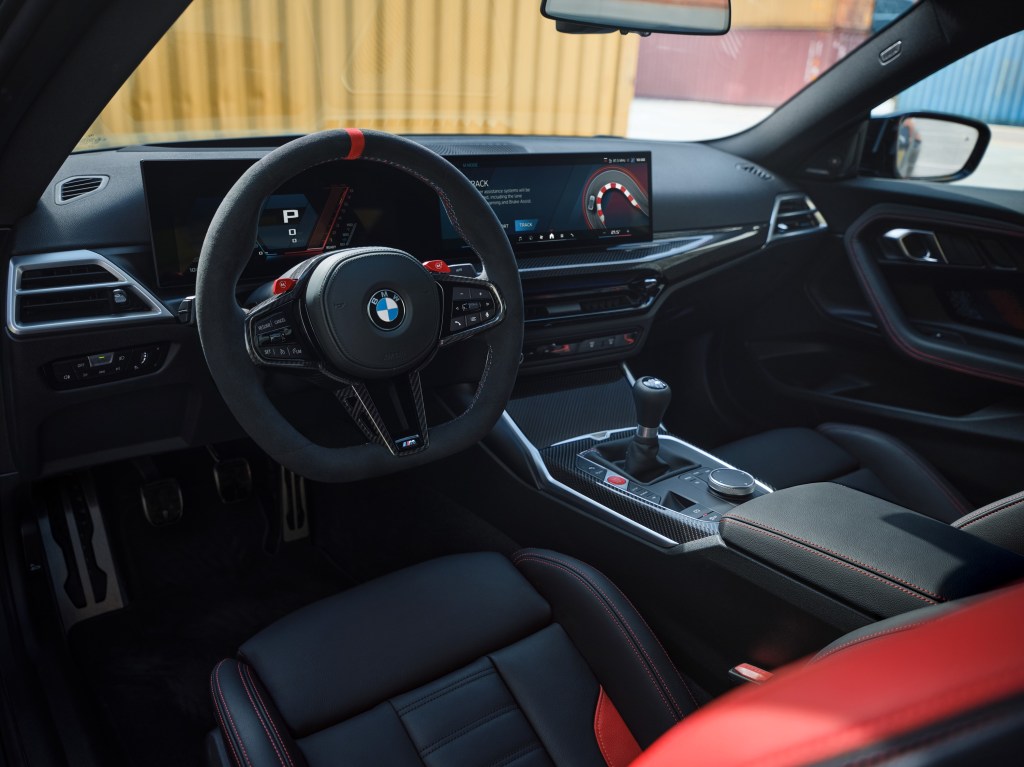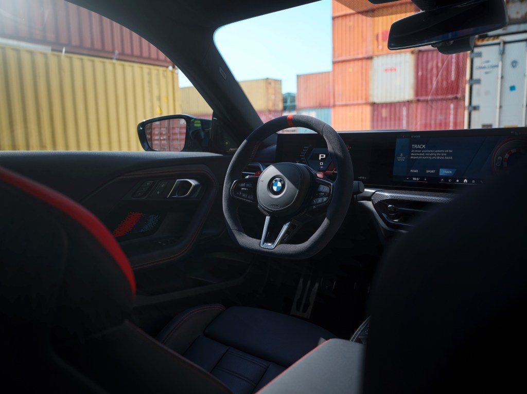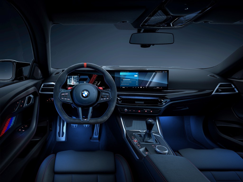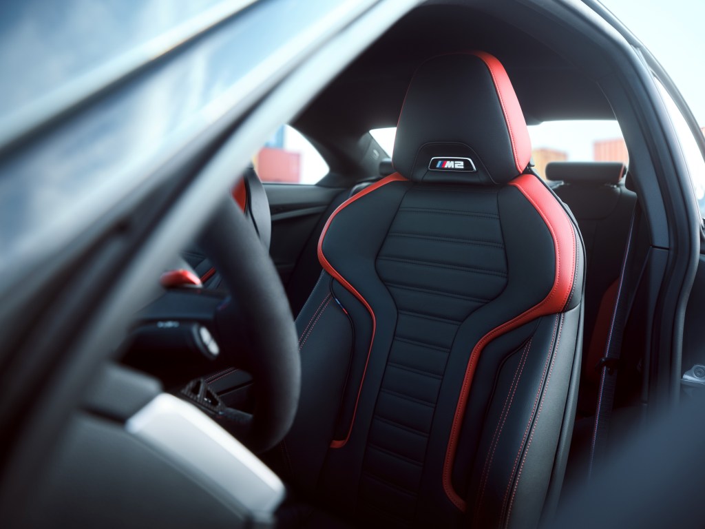 全新BMW M2車室空間也重新升級,全新造型M Nappa真皮平底方向盤含紅色12點鐘方向標記,為喜愛激烈操駕的車主帶來操控自如且熱血奔騰的駕馭氛圍,而追求臻稀限量的車主可以選配在量產車型中首見的M Alcantara麂皮平底方向盤。標準配備的M碳纖維飾板含碳纖維方向盤飾蓋及碳纖維換檔撥片(M Steptronic車型),瞬間點燃車內濃厚的辛烷值。全新Vernasca真皮內裝Black/Red highlight配色,更為全新BMW M2車主創造最熱血澎湃的駕馭情境。全新設計儀表檯飾板搭配新式冷氣出風口氣氛燈,為乘客打造兼具豪華且舒適的車室空間。BMW Operating System 8.5為駕駛提供更圖像式且直覺的使用邏輯,而全新標配的AR擴增實境導航功能讓兼具日常使用的BMW M2在道路行駛時擁有更精準確實的視覺化指示。