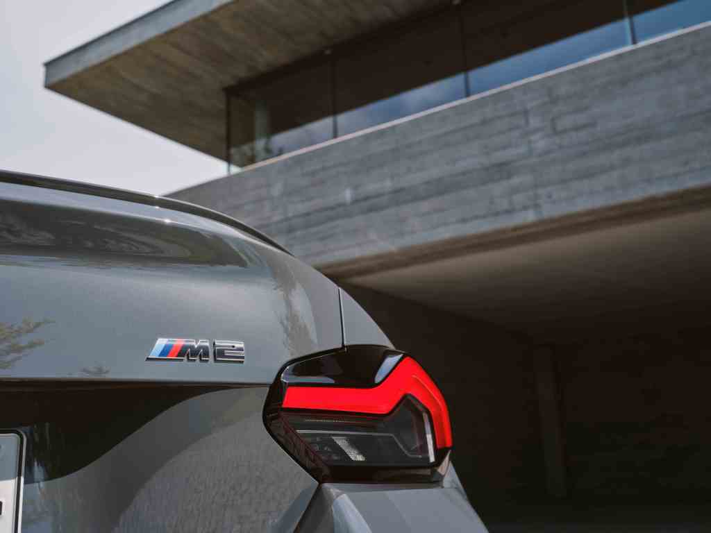 專屬BMW M2的雙腎型橫柵式水箱護罩採無邊框設計,搭配大面積的矩形下氣壩與兩側進氣口,充滿賽車跑格且兼具優化空氣力學與冷卻效能設計,是全新BMW M2最不容錯認的專屬設計語彙。向經典車款BMW 2002致敬的頭燈造型,同樣以矩形輪廓融合於前保桿設計中,搭配光型變化智慧LED頭燈及遠光燈輔助功能,夜晚中以銳利目光提供駕駛更安全的照明科技。全新BMW M2車側表面平整而流暢,格外突顯車身張狂醒目的肌肉線條,方正且寬體的輪拱造型搭配全新銀色的前19、後20吋的M雙輻式930M型輪圈,為蓄勢待發的BMW M2增添狂放不羈的競技氛圍。黑色高光澤車型M2銘牌以銀色包圍,為霸氣的車尾增添巧奪天工的絕佳亮點。