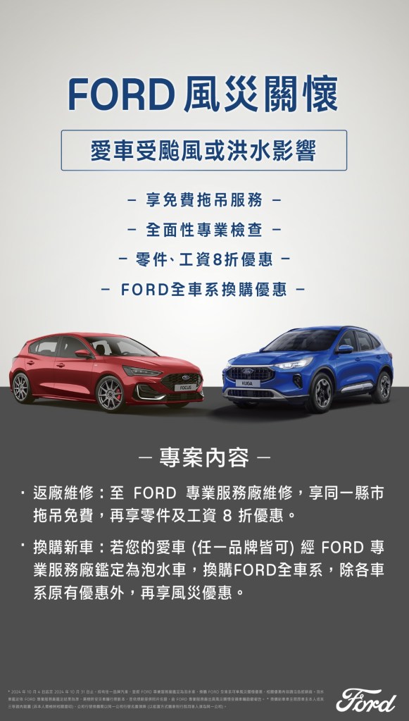 福特六和即刻啟動Ford車主專屬之天然災害相關服務和各項優惠,若因颱風或洪水影響而造成愛車受損,請撥打0800-032-100並由Ford專業服務廠竭誠提供下列服務內容: