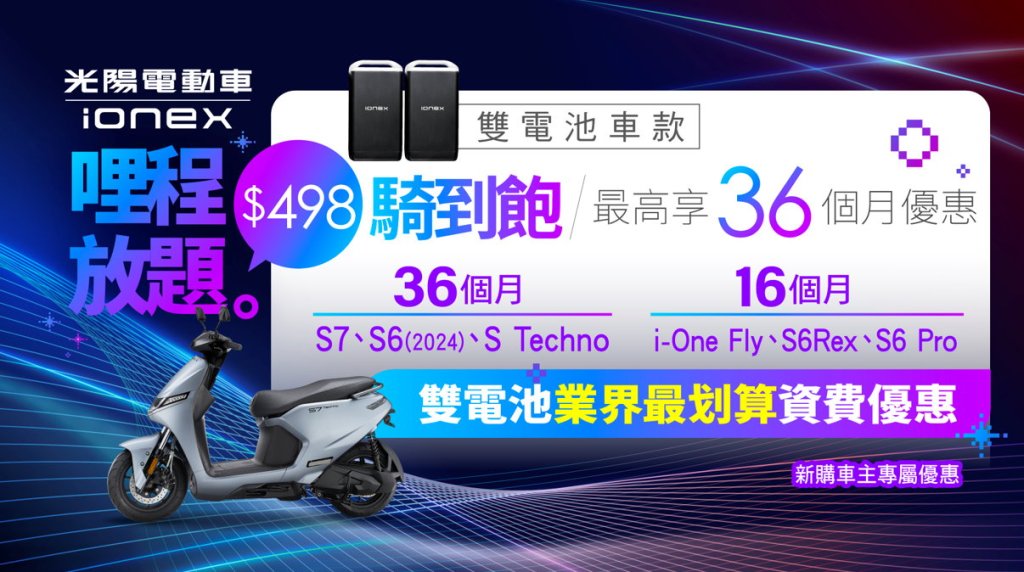 KYMCO董事長柯勝峯表示:「Ionex電動車推出滿足低哩程用戶的單電池車款輕移動方案「88利集省」、最高48個月優惠,以及滿足高哩程用戶的雙電池車款「498騎到飽」、最高36個月優惠,讓擁有不同騎乘需求的消費者,都能輕鬆擁抱電動機車時代的來臨。」
