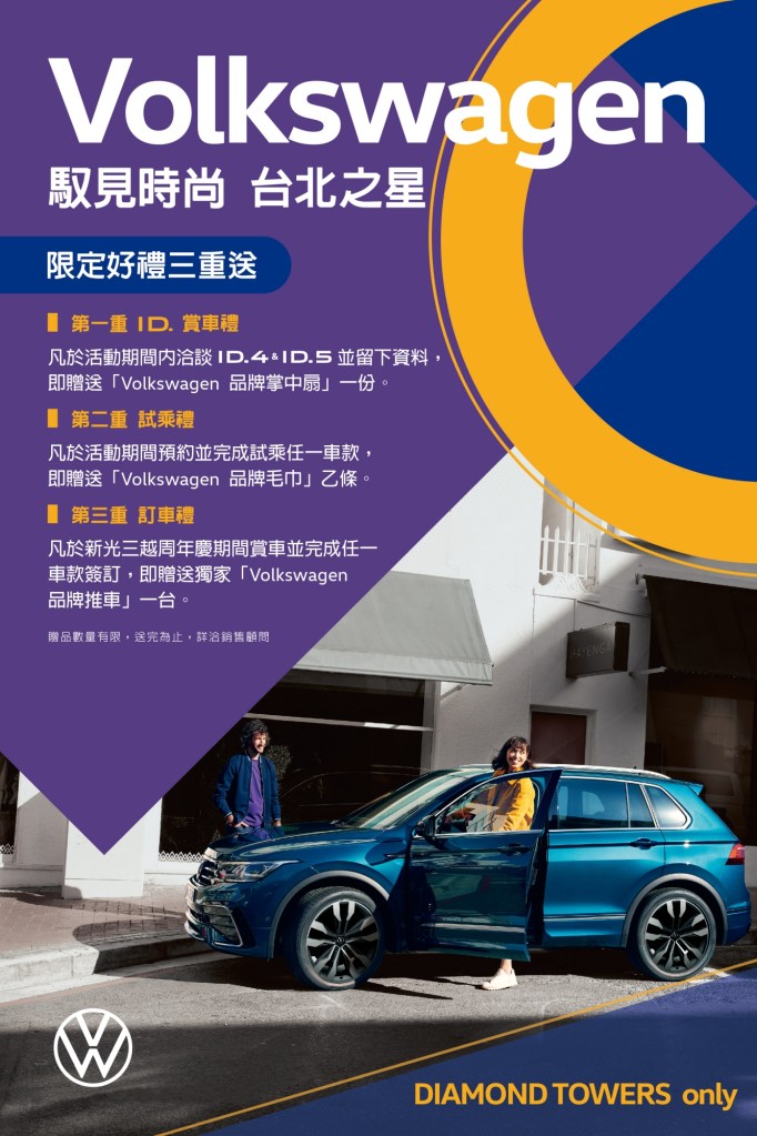 為了讓消費者能近距離接觸,即日起至2025年1月7日,太古福斯大台北展示中心於台北新光三越DIAMOND TOWERS(台北市大安區忠孝東路三段268號)除展示The Golf、The Tiguan等熱門車款以及最新純電車系The new ID.車款外,再享限定好禮三重送:凡賞車並且留下資料,即贈「Volkswagen掌中扇」一份、於展示時間預約且完成試乘,可獲得「Volkswagen品牌毛巾」一條、於新光三越周年慶期間賞車後,簽約任一車款,可獲贈「Volkswagen 品牌推車」一台,多重好康,驚喜連連,敬請把握時間前往。