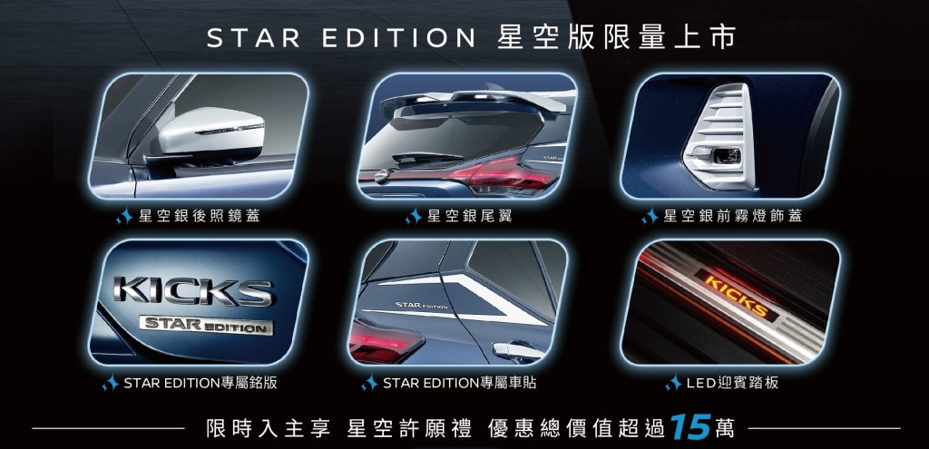 註7:NISSAN KICKS e-POWER「星空許願禮」專案,總價值超過15萬元:非星空版車款,可享有好禮二至好禮六之活動好禮,總價值約13.5萬元,此優惠不得與其他優惠共同使用,公司車、營業用車、大宗批(標)售等另有規定,請詳參下方活動內容。