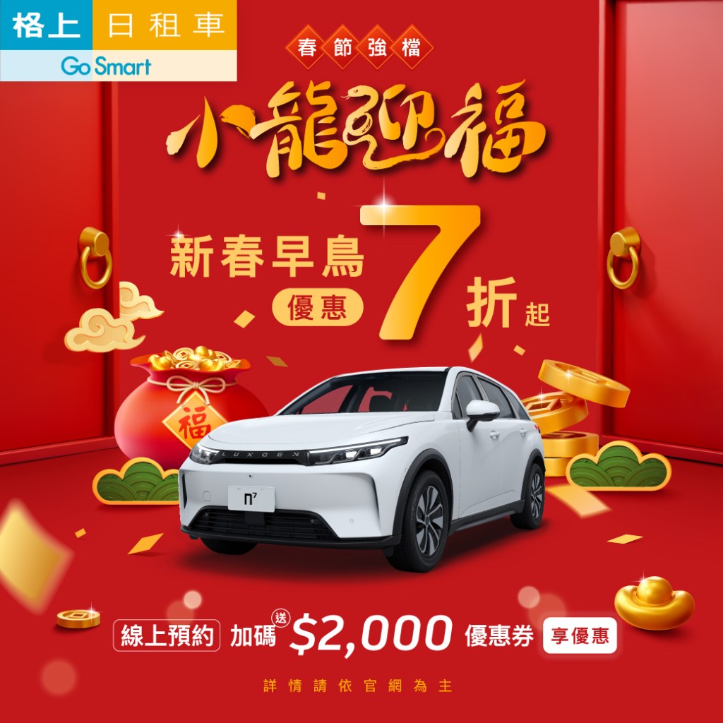 2025年農曆春節腳步接近,格上租車Go Smart小龍迎福專案即刻開跑!針對早鳥預約提供13大品牌、超過40種車款,以最低折扣7折優惠,滿足小家庭到大家庭民眾返鄉、走春的移動服務需求。此外,線上訂車再享加碼好禮贈,最高可領2,000元優惠券。