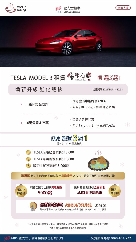 一轉眼又到了年末換車潮,租賃車是企業節稅省錢的最佳方式,個人使用租賃車則可享有隱私以及保費較優惠等好處。歐力士租車本季推出【優租有禮】TESLA租賃方案,Model 3煥新版入門車型170萬有找,是入門電動車的最佳選擇;還有拿下2024年電動車掛牌數第1名的Model Y,是純電休旅車的人氣車款,本期除了舊戶免費贈送隔熱紙,新戶轉租到歐力士再贈充電點數5000點;參與本期方案再抽Apple Watch,讓你電動車搭配智能錶,從裡到外都錶裡如一。