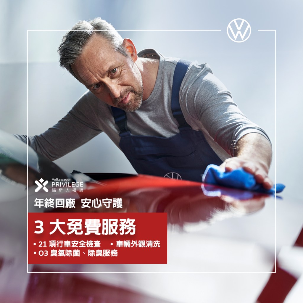 台灣福斯汽車總裁Steffen Knapp表示:「Volkswagen始終致力於為車主提供優質的服務和維修保養品質,期望每位車主都能安心體驗品牌駕馭樂趣,特別祭出年終回廠活動回饋車主一整年的支持,並且藉此機會在歲末之際為車主愛車進行最周全的診斷。」至2025年 1 月 24日止,台灣福斯汽車推出年終3 大免費服務,包括21項行車安全檢查、 O3 臭氧除菌/除臭、車輛外觀清洗。其中,21項行車安全檢查涵蓋雨刷片、煞車、輪胎、電瓶、水箱、冷氣溫控面板以及空調粉塵濾網,全方位把控最佳行駛狀態。