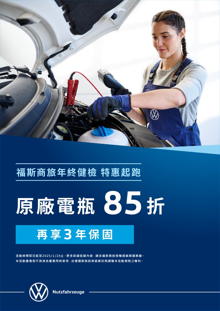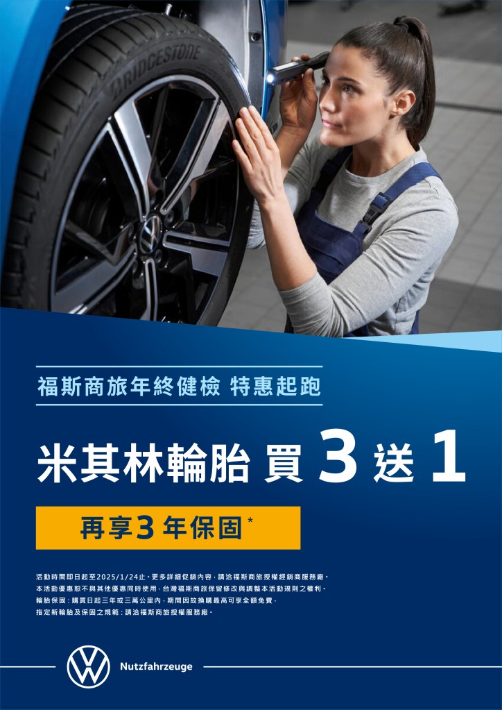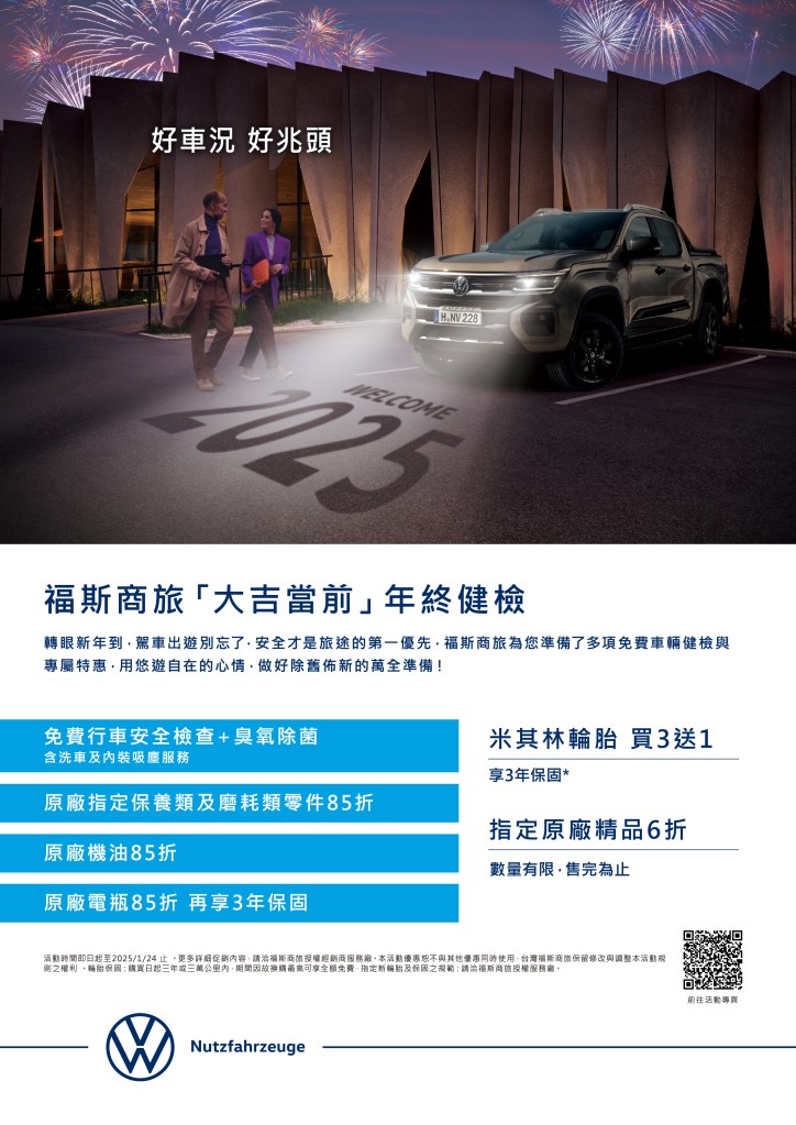 福斯商旅為了回饋忠實車主,更加碼推出限量好禮,凡於「大吉當前」年終健檢活動期間,即可享有米其林輪胎買3送1優惠,再享3年保固;另有指定原廠精品6折特惠(數量有限,售完為止),感謝您一路相伴,福斯商旅為您的旅程提供最安全、最安心的保障。