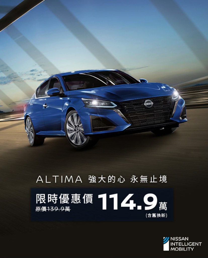 註2:優惠期間內下訂NISSAN ALTIMA「極致尊爵版」並完成領牌程序之新車車主,方具備ALTIMA專案優惠資格,享20萬元購車金,詳細交易條件請洽NISSAN及各經銷公司,NISSAN及各經銷公司保留最後解釋及核准與否權利。