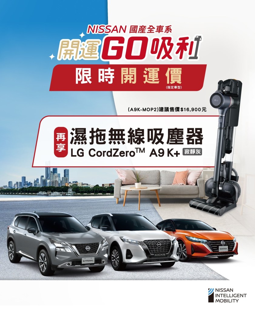 NISSAN 於12月限時延續「開運GO吸利」國產車系購車優惠專案,入主NISSAN國產全車系即可享購車金優惠及LG CordZero™ A9 K+系列濕拖無線吸塵器,LG 全新 CordZero™ A9 K+系列濕拖無線吸塵器(型號 A9K-MOP2)搭載 220W 強勁吸力與智慧雙旋濕拖吸頭,實現邊吸邊拖的高效清潔,用戶可透過 LG ThinQ APP輕鬆監控電量與清潔紀錄,提升日常清潔的便利性與智慧化,多款吸頭組合滿足家用、車用與床鋪清潔需求,為新車和居家環境帶來徹底又方便的無塵體驗。