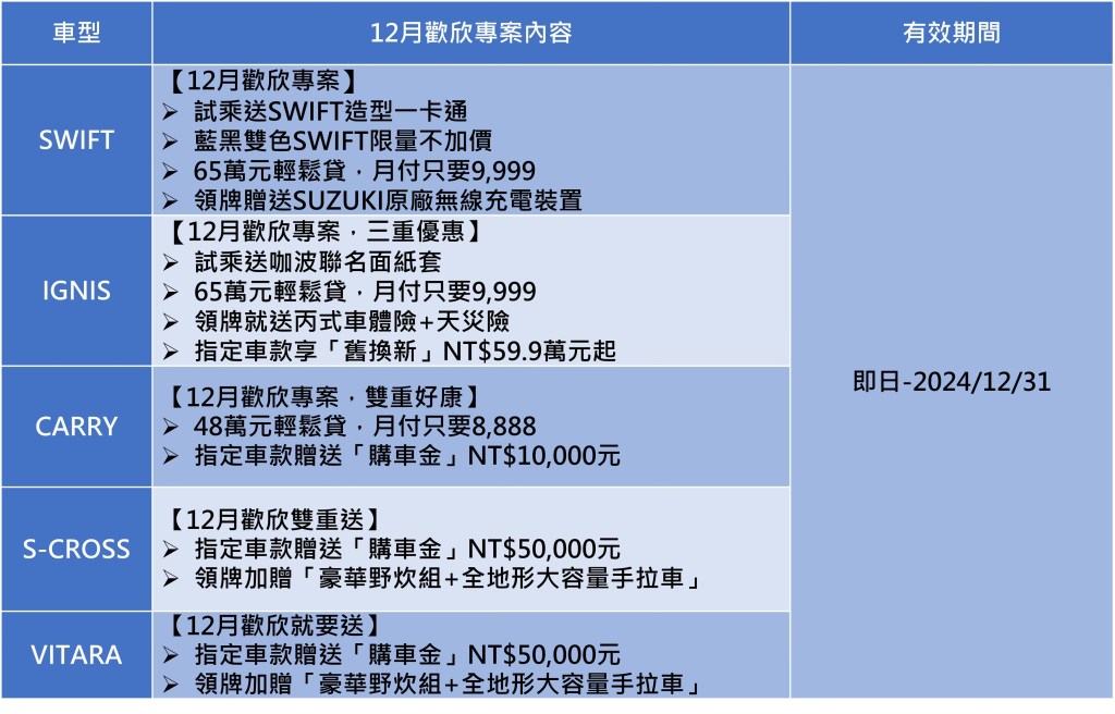 TAIWAN SUZUKI「12月歡欣專案」,凡在12月購買城市經典SWIFT,領牌贈送價值15,000元【原廠無線充電裝置】;購買越野經典VITARA,或購買生活經典S-CROSS,領牌有機會獲得價值30,000元【豪華野炊組+全地形大容量手拉車】;另外還提供務實超值的購車優惠,詳情如下: