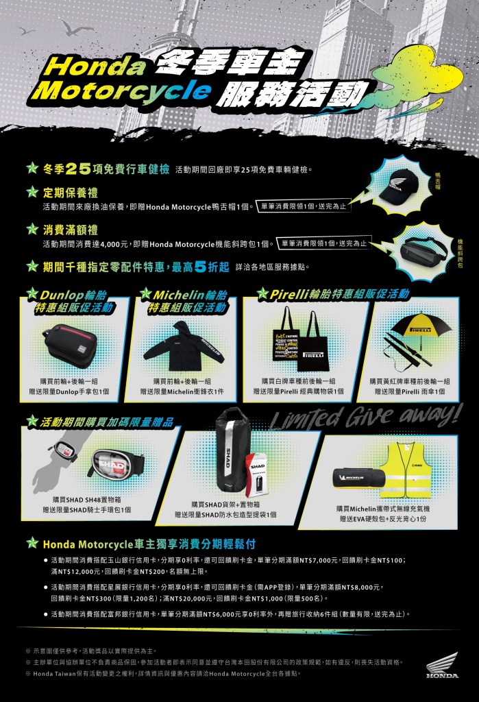 涼爽的氣候,是Honda騎士們最喜愛的騎乘季節,為了讓親愛的車主於冬季開心出遊,平安回家,創造安全的騎乘環境與完善的車輛整備是很重要的一件事,Honda Taiwan於2024/12/2至2025/1/24於各區Honda Motorcycle經銷商舉辦冬季車主服務活動,提供完整25項免費車輛健檢外,凡是購買Dunlop、Michelin、Pirelli前後輪一組,SHAD貨架及後箱即可獲得不同好禮;此外,活動期間千種指定零配件優惠活動同步實施中,邀請所有Honda Motorcycle車主回廠享受服務,創造每一次騎乘的開心回憶。