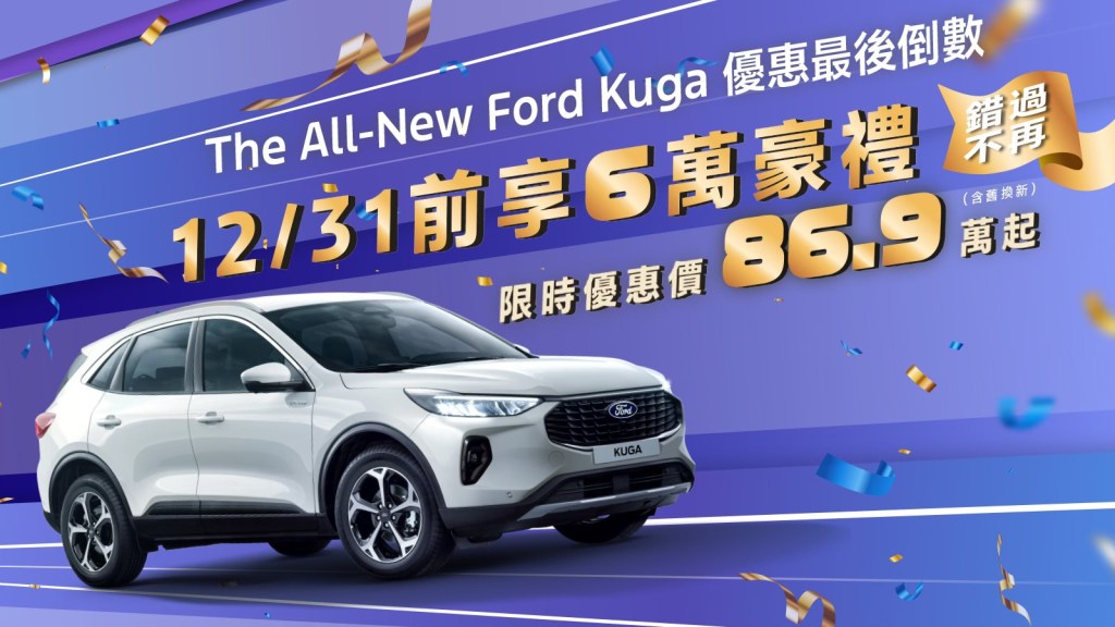 為回饋消費者支持,年終促銷優惠倒數,錯過不再!即日起至12月31日,入主The All-New Ford Kuga指定車型享限量優惠價舊換新86.9萬元起,指定車型並贈送總價值最高6萬元的「尊榮6大豪禮」:1萬配件金、2萬限時購車金、3萬元輕鬆開回家(或低月付9,990元起)入主方案、3年免費更新預判系統專用導航圖資,同時下訂即送限量Ford酷涼隨行杯,試乘再抽百萬豪禮!The All-New Ford Kuga改款配備有感升級超過15萬,讓利超過20萬!讓消費者不用90萬即可體驗「歐系駕馭樂趣」、「領先智駕輔助科技」,多項超越國產同級配備,滿足台灣市場對於休旅車的各種想望。