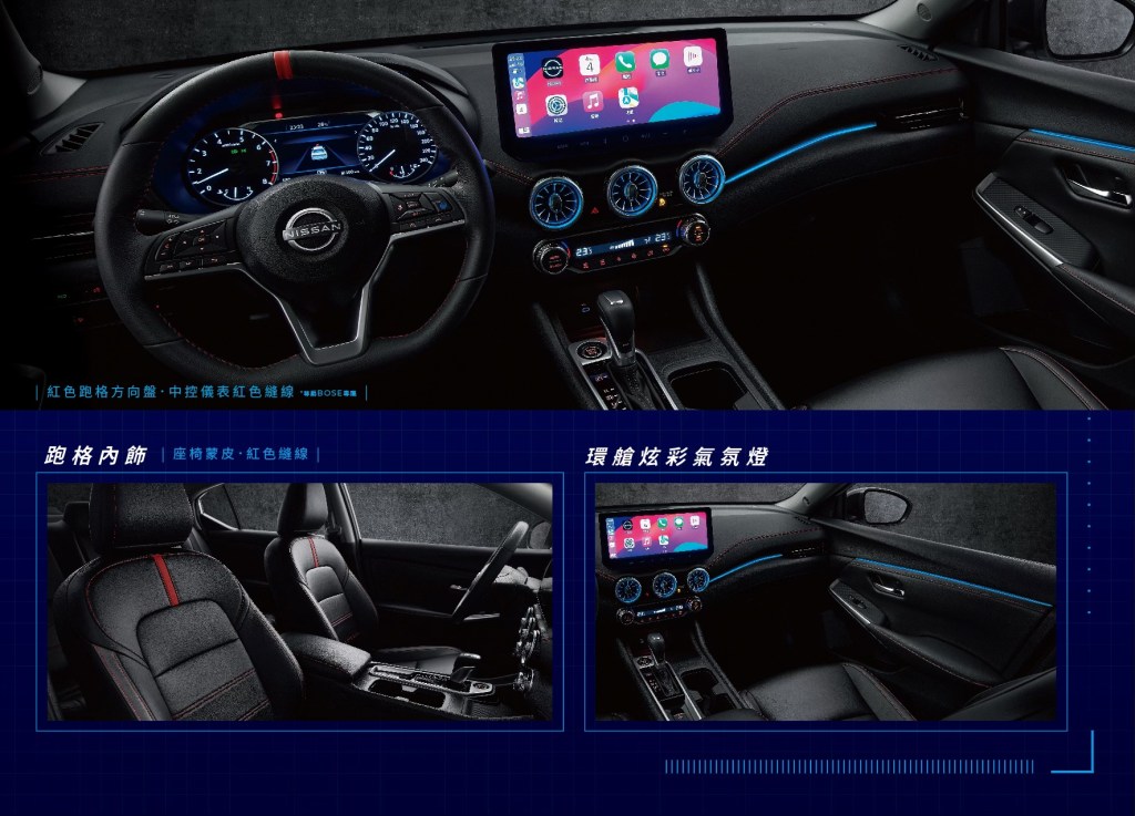 NISSAN ALL NEW SENTRA「黑化雙生版」提供冷傲白、冷傲白搭配黯夜黑頂及疾風藍搭配黯夜黑頂3種車色,外觀升級5項配備,包含閃爍非凡銳利眼神的「藍紋頭燈」、夜晚中獨領風騷的「藍翼迎賓光流照地燈」,再搭配「全新黑化水箱護罩」、「黑化保桿飾條」、「黑化鋁合金輪圈」,營造出與眾不同的個性化外觀,成為街道上的目光焦點。內裝則限量升級3項配備,包含內建7種色彩顏色、可手動調控燈光大小及色彩變換的「環艙炫彩氣氛燈」、營造車內運動化氛圍的「紅色方向盤定位標」,及搭配熱血「紅色座椅縫線」,整體內裝更顯濃烈跑格。(註3)