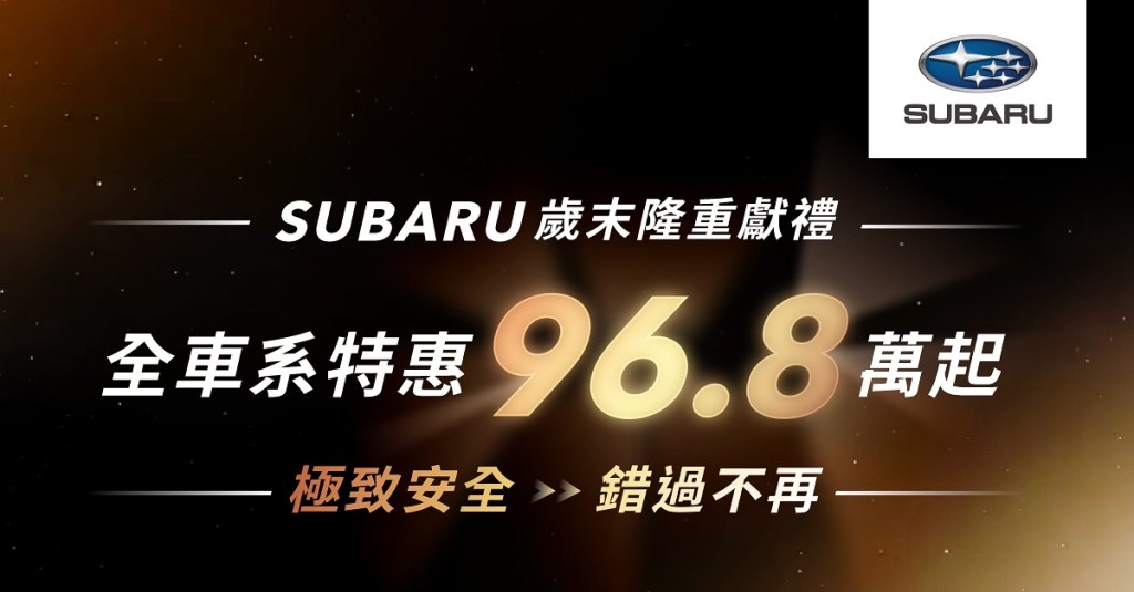 歲末年終時節將至,SUBARU持續為消費者提供最實質的回饋禮遇,即日起至12月31日止,推出「SUBARU歲末隆重鉅獻」購車專案,全車系最低特惠96.8萬起,即可輕鬆入主日本原裝、極致安全的座駕。