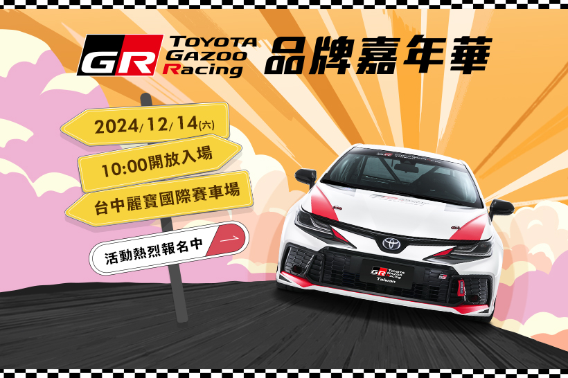 即將於12月14日星期六早上10:00於台中麗寶賽車場開放入場的「GR品牌嘉年華」,可是台灣第一次結合賽車運動、車主活動、趣味體驗、美食精品所舉辦的大型品牌嘉年華,也是TOYOTA善盡社會責任、寓教於樂的重要活動,相信在民眾的熱情參與下,必能替台灣賽車運動立下新的標竿,並進一步成為全民所熱衷的運動。
