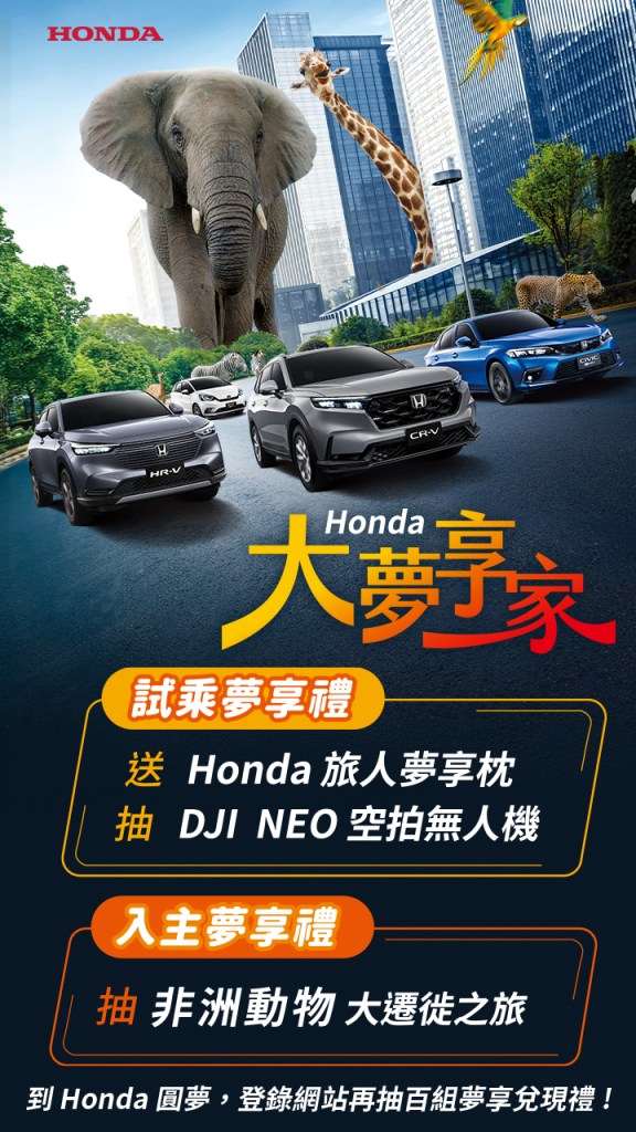 本月入主Honda全車系並完成領牌的準車主們,即有機會獲得價值50萬元的「非洲動物大遷徙之旅雙人遊」(月月抽1組,共2組名額)。此外,為持續滿足廣大消費者對個性化駕馭的追求,Honda Taiwan 同步推出全車系「Honda馭光特仕版黑化套件組」、另享「高額零利率*1」與「5年延長保固」,限定車型限時優惠最高16萬元豪禮,讓Honda即刻帶您開啟自由馳騁的黑潮駕馭新篇章。