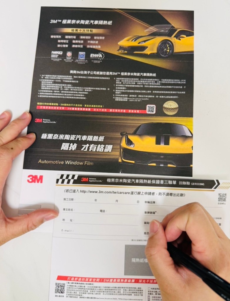 3M隔熱膜系列產品,以創新科技及優異產品力深耕全球汽車市場,為杜絕近年來市面上來路不明的汽車隔熱紙,以3M品牌銷售混淆視聽,產品來源及施工品質參差不齊,造成消費者權益受損,3M以一貫堅持追求優質產品及施工品質的雙重把關,與3M台灣汽車隔熱膜原廠授權經銷商 – 汎瑋材料科技股份有限公司共同呼籲消費者,在選擇3M汽車隔熱紙同時,務必認明3M原廠授權施工商做安裝施工,施工完成後記得索取售後三聯單並登錄保固,特別提醒,為確保車主不受來源不明水貨混淆,即日起車主至3M原廠授權施工商安裝「3M™極黑汽車隔熱紙」,請認明新款黃色保證書三聯單,才能享有3M汽車隔熱紙原廠5年保固,若是由原車廠張貼則維持原版保證書三聯單。3M 交通運輸與電子產品事業部行銷經理王玫晴表示:「3M汽車隔熱紙是市面上許多車廠及車主指定使用品牌,為保障所有張貼3M汽車隔熱紙的車主能享有最舒服的駕駛感受,同時擁有3M原廠最完善的產品品質及售後服務,請消費者在選購時務必認明「3M原廠授權施工商」,安裝後記得索取「保證書三聯單」,掌握兩大重點,就能享有原廠授權施工商的技師高品質流程安裝及原廠產品保固,讓車主安心選擇更有保障。」