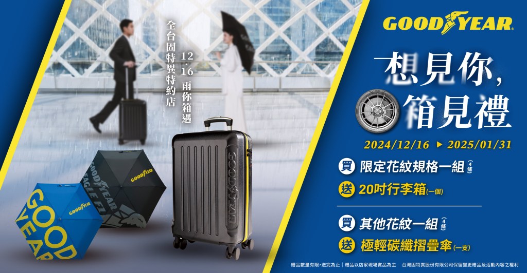 即將進入 2024 年尾聲,準備好迎接全新的 2025 年了嗎?不論是和心愛的人來一場年末旅行,或是和家人安排一起過年出遊,固特異推出「想見你,箱見禮」冬季購胎優惠活動,讓車主能換上全新性能卓越的輪胎,享受安心的駕乘體驗,迎接美好的旅行時光。即日起至 2025 年 1 月 31 日,凡購買 1 組(4 條)Eagle F1 Asymmetric 6、Assurance ComfortTred、ElectricDrive 全系列,或 Assurance MaxGuard、Assurance MaxGuard SUV 16 吋以上(含),即送 20 吋固特異時尚酷黑行李箱一個。此外,凡購買 1 組(4 條)非上述限定系列之其他花紋輪胎,即可獲贈固特異時尚極輕碳纖摺疊傘一支,數量有限,送完為止。