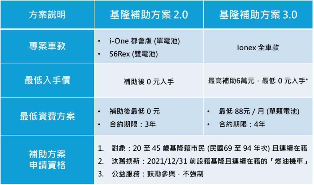 明(25)年開始,基隆市民不僅可選擇「2.0專案」搭配最低0元資費方案,免費申請暢銷車款i-One都會版 (單顆電池) 與S6 Rex暴龍系列 (雙顆電池);如果對專案外的車款心有所屬,也可以選擇最高補助6 萬元購車金的「3.0專案」, Ionex 光陽電動車全機種皆能申請,搭配補助後「i-One Air」及「酷玩 CoolOne」更是等同免費入手,消費者僅需負擔電車資費!光陽也宣布單顆電池方案「88利集省」好評再延長一季,最低88元、最長48個月,有興趣的消費者請不要錯過!