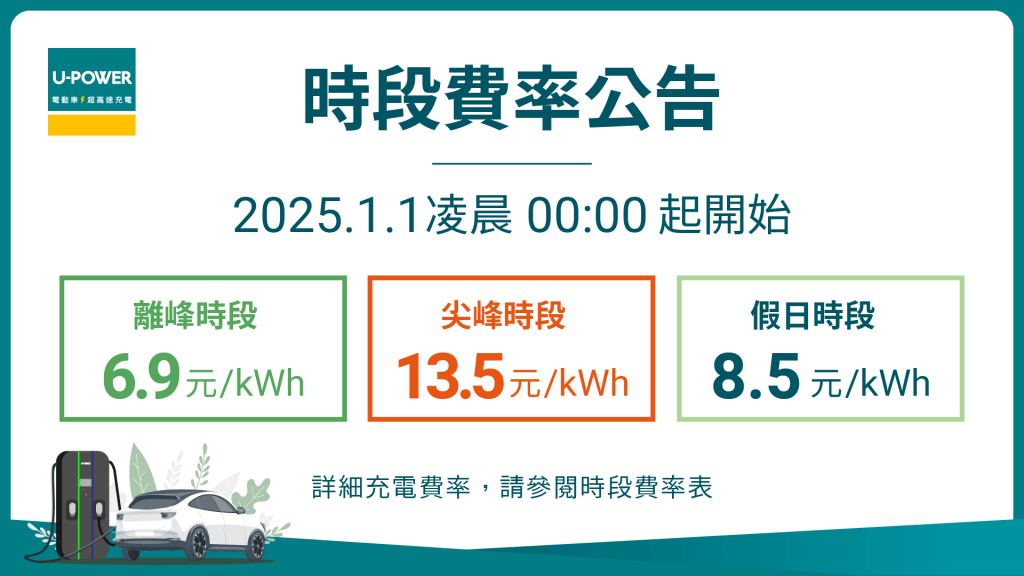 本次電價調漲後,尖峰時段費率已來到每度電12.47元,因應電力成本上漲,U-POWER 宣布自2025年1月1日起,調整部份充電費率:離峰費率「不變」維持每度電6.9元,尖峰費率「調漲」為每度電13.5元,假日費率「調降」至每度電8.5元。