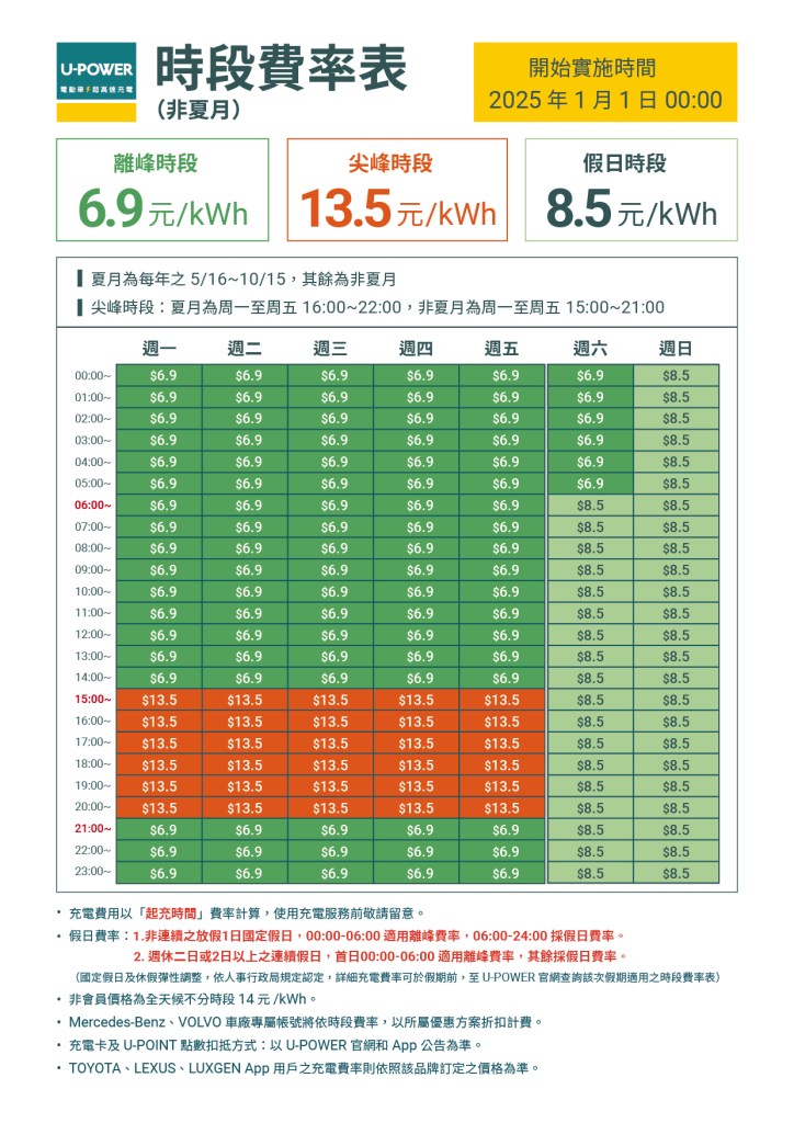 為確保營運之永續,U-POWER 旭電馳科研宣布自2025年1月1日凌晨00:00起,調整各時段充電費率。調整後的費率分為「離峰費率:6.9元/度電」、「尖峰費率:13.5元/度電」及「假日費率:8.5元/度電」,非會員價則調整為 14 元/度電。