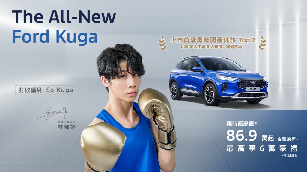 | The All-New Ford Kuga | 2025年1月1日至1月24日止 入主指定車型享6萬豪禮:1萬配件金、2萬限時購車金、3萬元輕鬆開回家(或低月付9,990元起)入主方案、3年免費更新預判系統專用導航圖資(市值3萬元)。 | ||