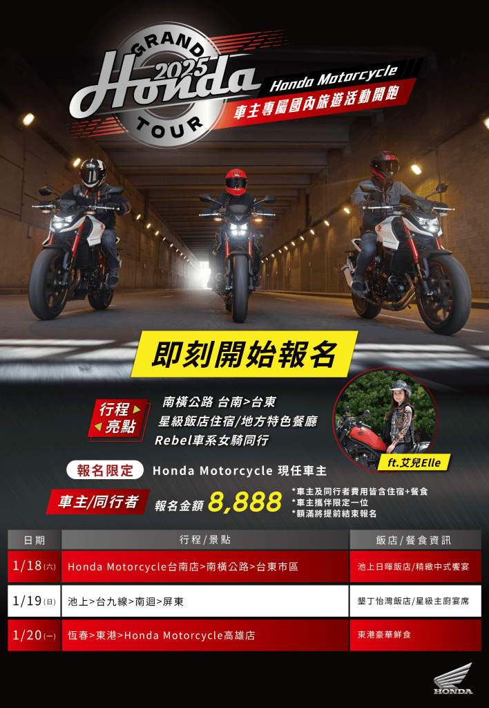 為了讓更多Honda車主體驗不同騎乘的樂趣,Honda Taiwan於今年舉辦「2025 Honda Motorcycle 國內二輪三日遊」於今日(1/8)開始受理報名,報名成功即可擁有本次Honda專屬多功能防水腿包。活動將帶領車主領略台灣三大橫向山路的山川壯麗,精心設計的路線,讓每位車主在騎乘中享受無與倫比的景致風光與人文風情之餘記錄台灣大自然鬼斧神工,結識來自各處Honda二輪車友之餘,此次更邀約Rebel車系女騎—艾兒elle同行。除規劃台東知名日暉渡假村及墾丁怡灣星級飯店,並安排精緻中式饗宴和東港豪華鮮食以體驗高規格 Honda 二輪的旅程。此次活動不僅是一場旅行,更是一次聚集台灣各地 Honda 二輪車主的盛會,透過分享彼此的騎乘經歷,創造無數珍貴的回憶,Honda Taiwan期盼與您一同踏上這場探索夢想與熱情的旅程,敬邀所有熱愛Honda的車主把握機會即刻報名吧!