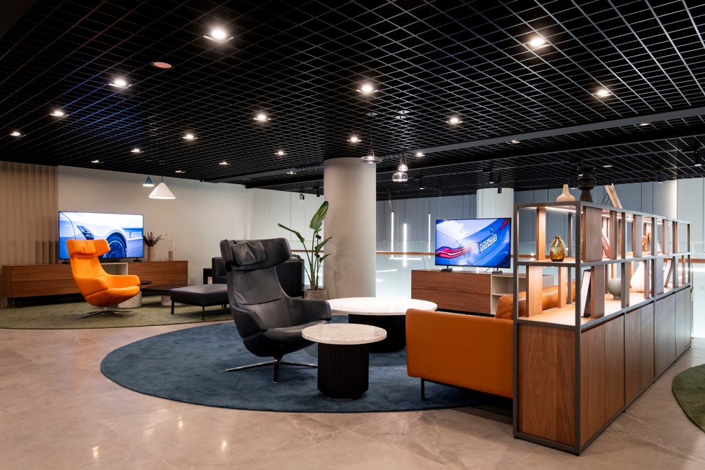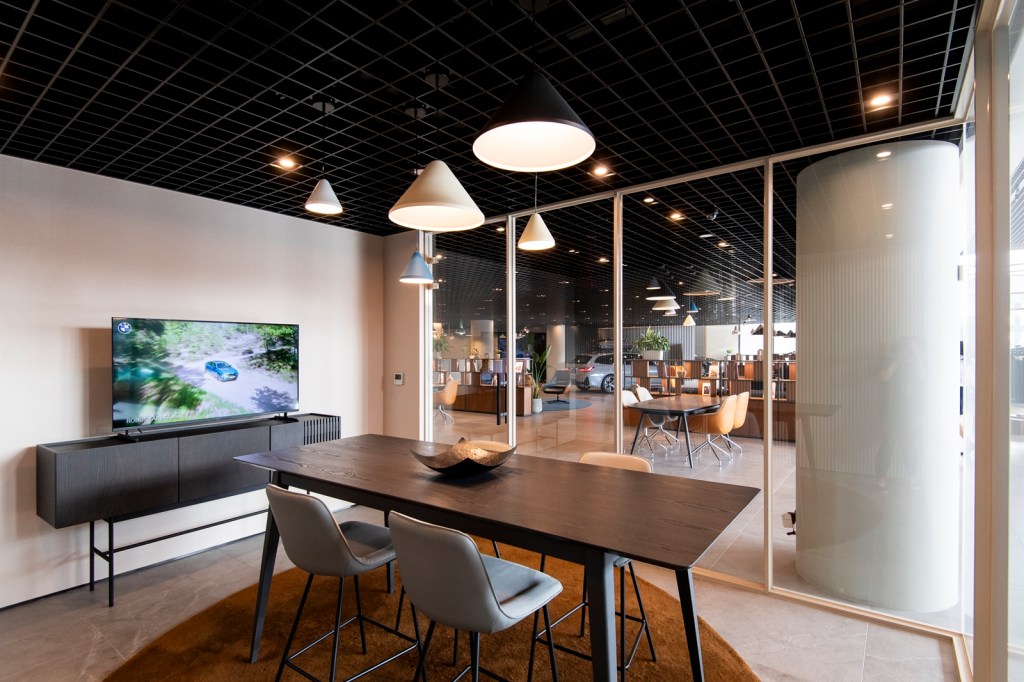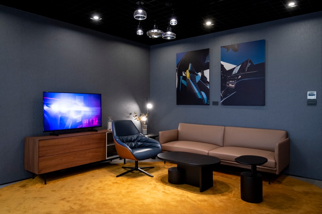 走進全新BMW Retail.Next展間,就像進入一場關於未來與美學的對話,沒有浮誇的堆砌卻用最純粹的設計語言講述了與眾不同的故事。深色的天花、地板與牆面,彼此延展交融,分區之間以懸浮式造型燈光點綴,宛如藝術展廳的燈光序曲,柔和卻不失張力,每一輛車不僅是展示的主角,更在這藝術氛圍中成為人與空間互動的情感紐帶。而這份細膩,延伸至展間的每一處角落,「物件」不僅是空間的裝飾,更是情感與品味的延伸,軟裝與家具的挑選經過反覆推敲,契合BMW品牌專屬色調,讓每一件物品與展車相互輝映。