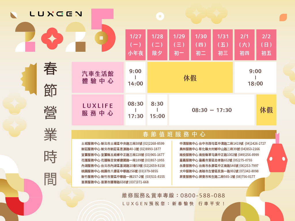 全台LUXGEN體驗中心與汽車生活館,小年夜當日(1/27)營業時間為上午9:00至下午2:00,除夕至初三(1/28-1/31)皆不營業,初四至初五(2/1-2/2)於上午9:00至晚上6:00皆有專人駐館服務,而初六(2/3)起恢復正常營業時間;而LUXLIFE服務中心,除夕當日(1/28)營業時間為上午8:30至下午3:00,年初一至初四(1/29-2/1)春節連假期間,自上午8:30至下午5:30皆提供緊急救援服務,年初五(2/2)不營業。