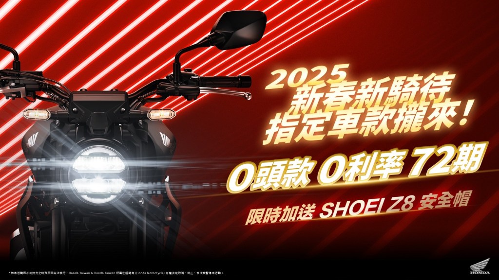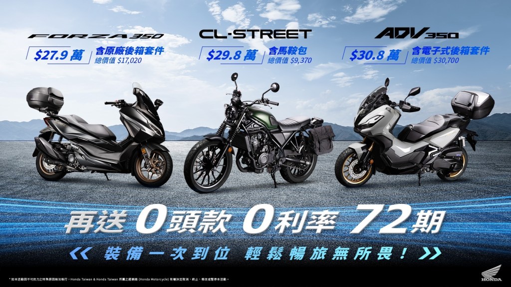 Honda Taiwan秉持「The Power of Dreams – How we move you.」的品牌精神,致力於提供卓越的產品與服務,讓每位喜愛二輪生活的顧客皆能享受Honda二輪產品所帶來的騎乘樂趣和自由感受,於今日推出「新春新期待 指定車款攏來」專案,指定車款72期、零頭款、零利率限時加送Shoei Z-8安全帽,讓您輕鬆擁有夢想中的愛車。另外,為了提升完美的騎乘體驗推出「裝備一次到位 輕鬆暢旅無所畏!」專案,Scooter級距的指標性車款FORZA350暢旅價:27.9萬,FORZA350高質感的外觀兼具通勤的便利性及運動化的性能表現,為了讓騎行更加便利,特別贈送原廠後箱(價值17,020),讓您無論是短途旅行還是日常通勤,每次出行都能輕鬆收納。冒險意象ADV 350暢旅價:30.8萬,ADV350在城市通勤車的外表下,以粗獷的線條以及色塊增添了冒險元素,加贈電子後箱(價值30,700),提供更多便捷的行李儲存選擇,讓您的冒險之旅更輕鬆、舒適。經典的復古風格CL STREET簡單而純粹,氣宇軒昂的外型、讓騎士盡情揮灑自我風格,暢旅價:29.8萬,加贈馬鞍包(價值9,370),輕鬆攜帶必備物品,隨時準備踏上下一段旅程,以上三台車款,再享72期、零頭款、零利率。